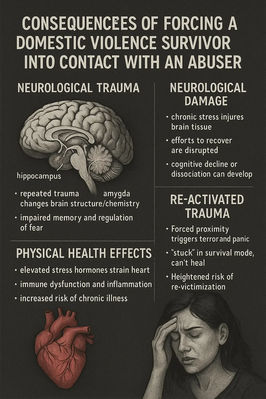 Psychiatric and legal scholarship underscore that such court-enabled harassment is deeply traumatizing. The retraumatization occurs on multiple levels: The survivor is forced to relive abuse by constant contact with the abuser in court, is disbelieved or treated harshly by the system, and finds no escape due to ongoing legal jeopardy. A 2021 law review article aptly labeled extreme post-separation litigation as “judicial terrorism,” noting that abusers use family courts “as a battering tool,” effectively terrorizing former partners from afar. This prolonged legal warfare “retraumatizes victims, preventing them from healing and building new lives.” The abuser counts on the court process itself to keep the victim in a state of fear and emotional turmoil. Studies of survivor-mothers confirm that legal abuse inflicts a “tremendous psychological toll” on victims and their children. Many develop classic trauma reactions: intrusive memories, panic attacks, depression, and hopelessness from being trapped in an unfair fight l. In one survey, 63% of women navigating court against an abusive ex reported feeling retraumatized by the process. Courts often compound the harm by failing to recognize this dynamic – treating the situation as a normal dispute and thereby denying victims validation or protection, which itself is experienced as a betrayal trauma.