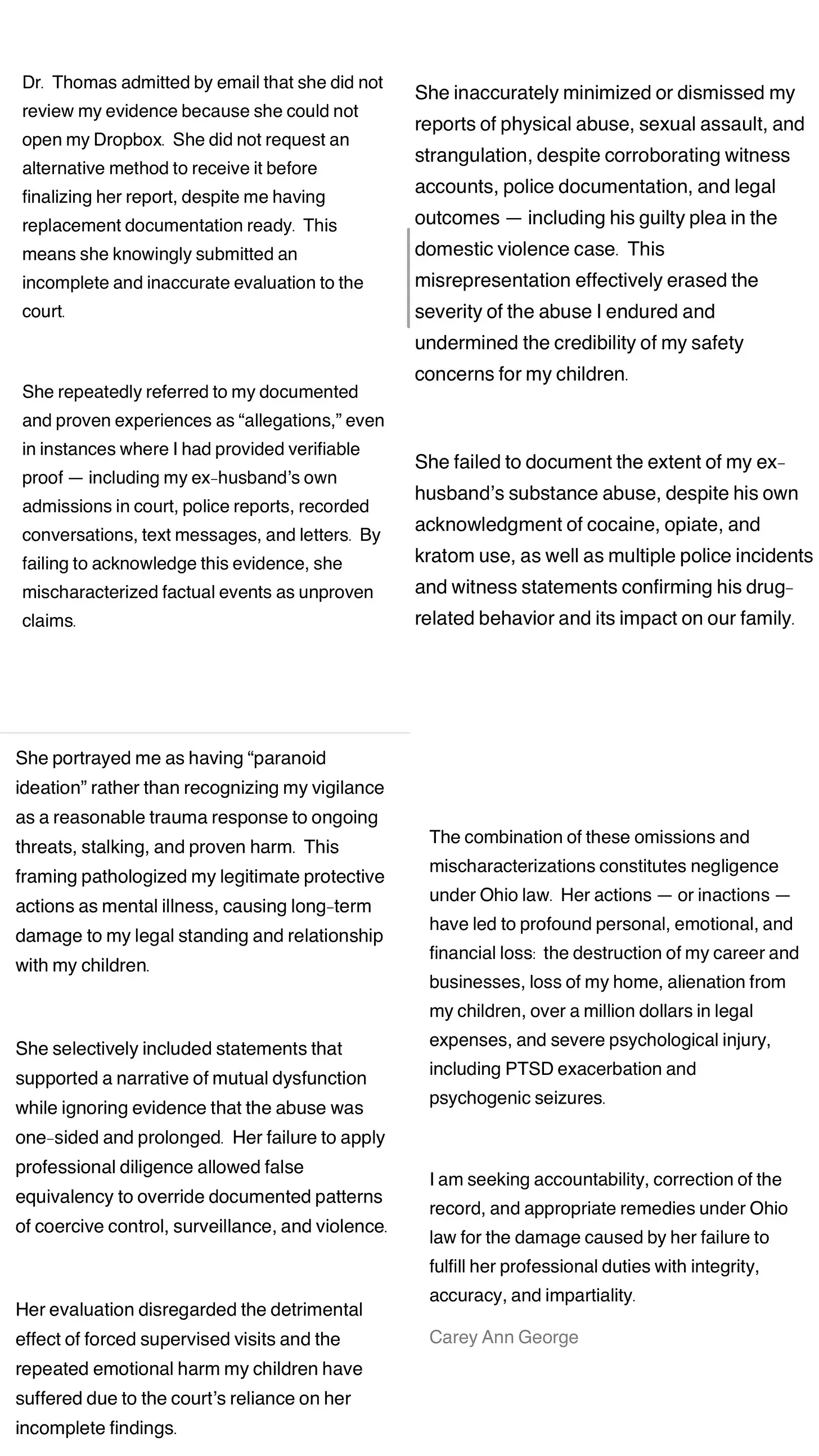 The consequences of such negligence go far beyond professional embarrassment. They can alter custody outcomes, endanger children, and inflict lasting emotional and financial harm. In my case, the flawed report contributed to years of supervised visitation, alienation from my children, over a million dollars in legal costs, and serious health impacts from prolonged trauma.