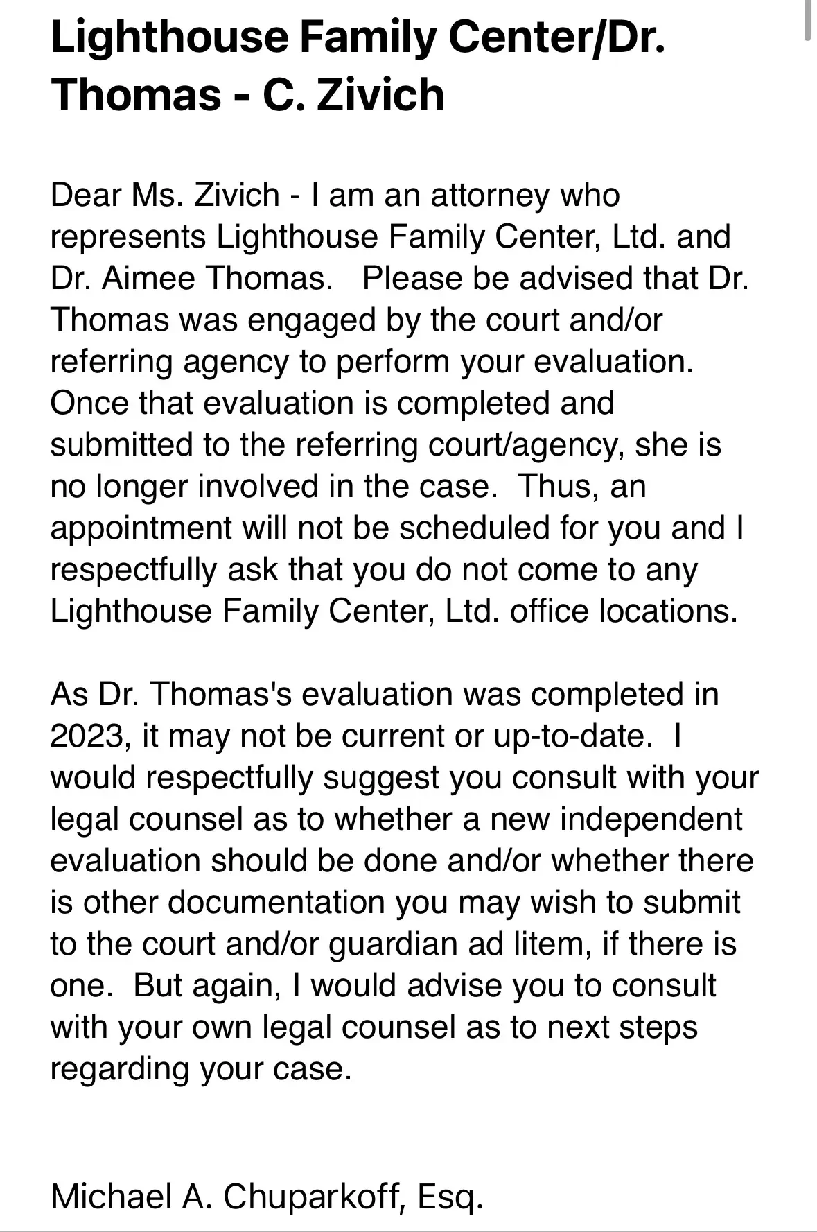 Rather than correcting these omissions when presented with evidence, the evaluator—through her attorney—formally refused further contact, citing the conclusion of her role. This maneuver may shield her from direct communication, but it does nothing to remedy the harm caused by the original negligence.