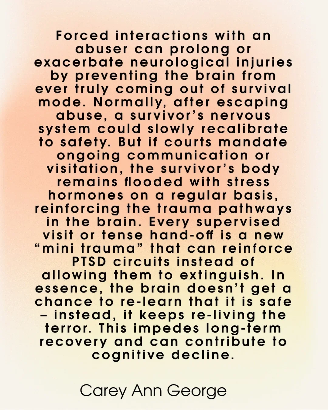 Despite these harrowing experiences, survivors and their advocates are speaking out, sharing their stories as cautionary tales in hopes the system will change. Organizations dedicated to court reform have compiled hundreds of survivor narratives showing a common theme: mandated contact with abusers prolongs and intensifies survivors’ trauma. These testimonials, alongside the scientific evidence, paint a clear picture. Forcing a domestic violence survivor to maintain contact with an abuser – via supervised visitation, co-parenting mandates, or court-ordered communication – can have severe neurological, physical, and psychological consequences. It risks actual brain injury from stress, fuels serious health problems, destabilizes the survivor’s mental health, undermines their recovery, and can endanger their life. As one survivor eloquently pleaded to a judge: “Please, don’t make me keep paying for the crime that was done to me. Every forced visit is like being sentenced again.” A trauma-informed, survivor-centered approach in family court would heed these consequences and prioritize true safety and healing over any presumption that an abuser has a right to continued access. The research and survivor voices resoundingly support that safety – including freedom from forced contact – is the foundation of recovery for domestic violence survivors.